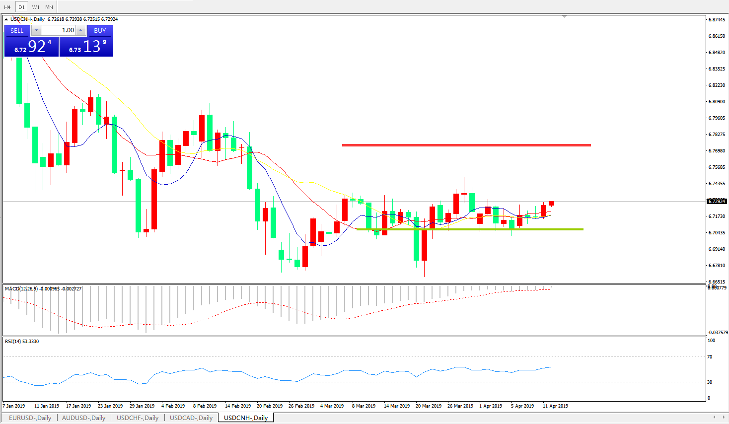 交易策略6.6990之上,看涨,目标价位为6.7845,然后为6.8185