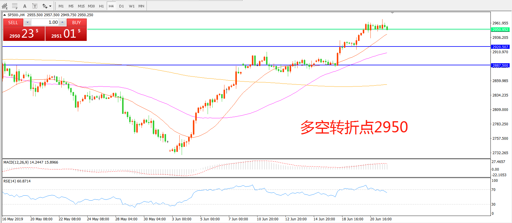 4小时图看,标普连续上行后维持高位震荡,上升动能依然较强,均线系统呈多头排列,MACD红柱减少,RSI指标向下,短期有回落风险。