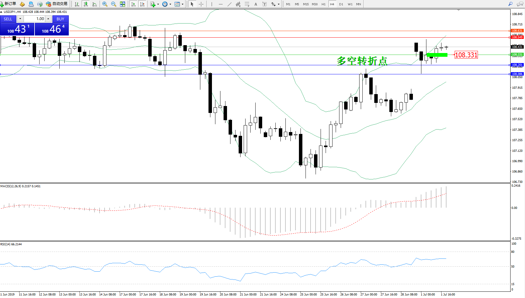 交易策略:108.331上方看涨,目标108.549108.631