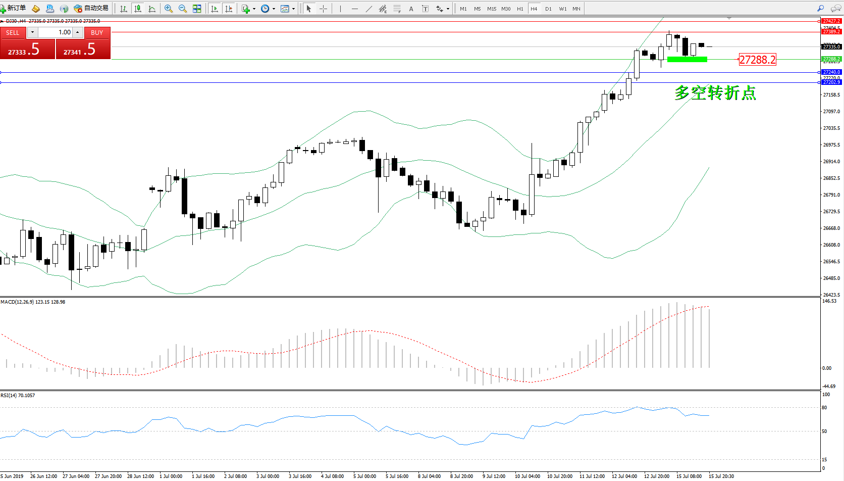 道琼斯指数DJ30—— 4小时K线图显示: