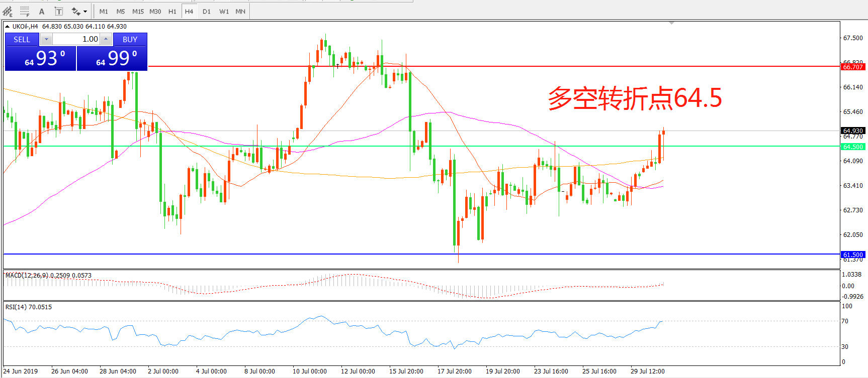 4小时图看,油价长阳突破前期整理区间,整体表现强势,200周期均线成为起涨点,MACD红柱增加, RSI指标拐头向上,日内延续上行可能较大。