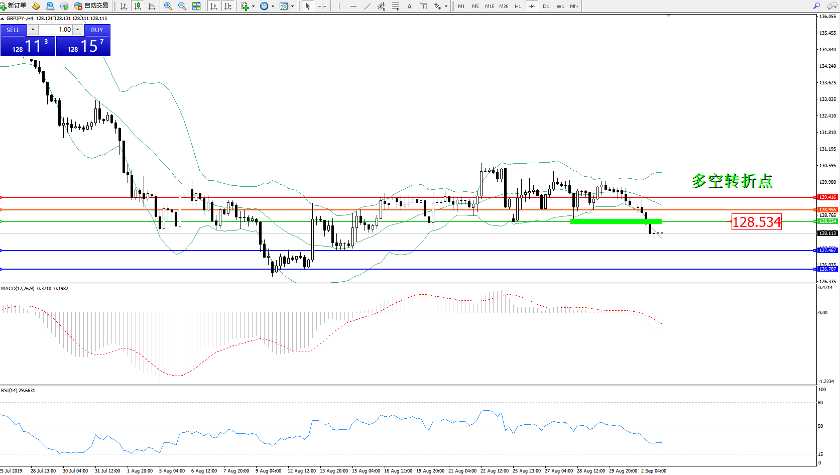 交易策略:128.534下方看跌,目标127.467126.787