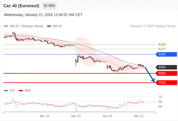 法国CAC指数期货 (Euronext) (G6) 当日内: 存在压力。