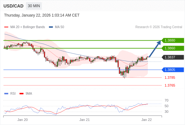 在 1.3805 之上,看涨,目标价位为 1.3860 ,然后为 1.3880 。