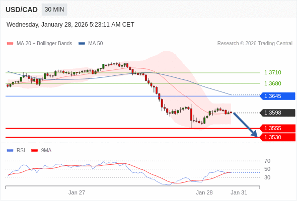 在 1.3645 之下,看跌,目标价位为 1.3555 ,然后为 1.3530 。