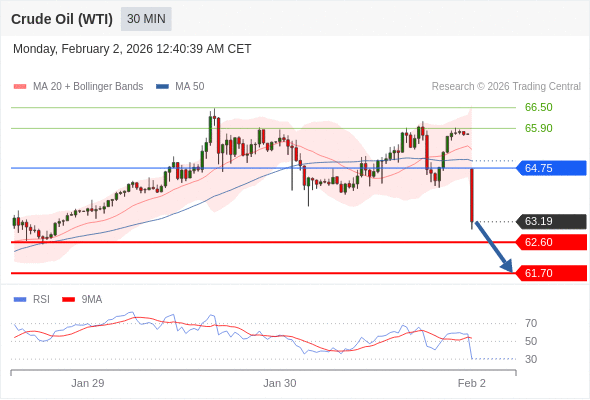 在 64.75 之下,看跌,目标价位为 62.60 ,然后为 61.70 。