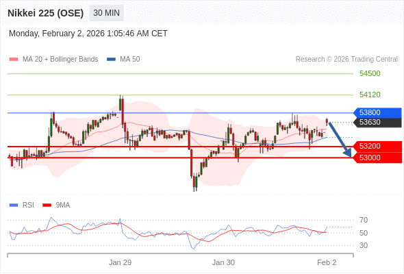 在 53800 之下,看跌,目标价位为 53200 ,然后为 53000 。