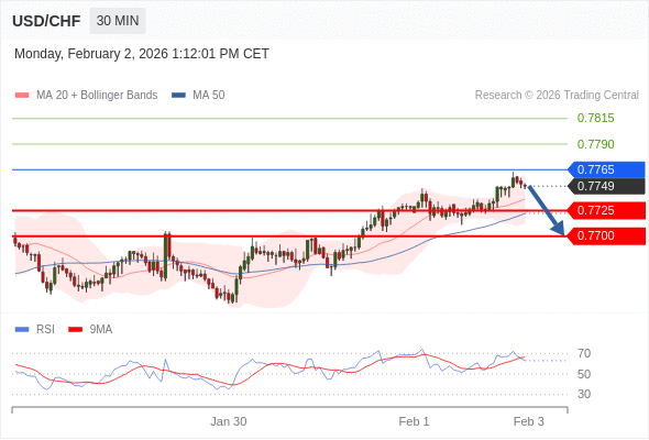 交易策略: 在 0.7765 之下,看跌,目标价位为 0.7725 ,然后为 0.7700 。