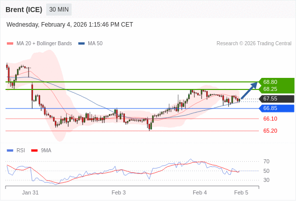 在 66.85 之上,看涨,目标价位为 68.25 ,然后为 68.80 。