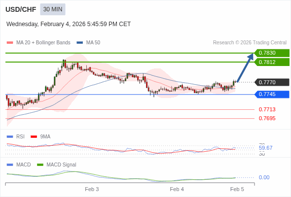 美元/瑞郎 当日内 : 看涨,当 0.7745 为支撑位。