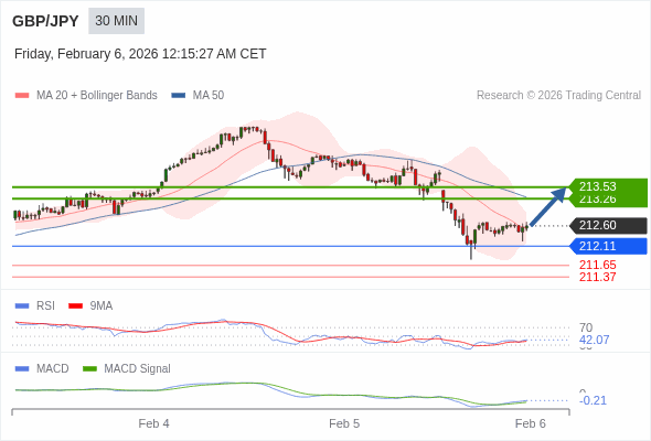 英镑/日元 当日内 : 有上涨的可能,目标价位定在 213.53 。