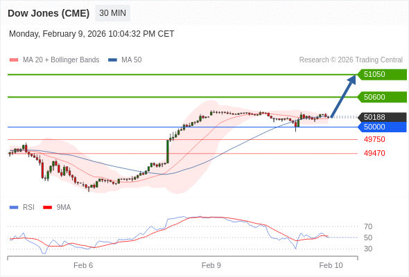 美国道琼斯指数期货 (H6) 当日内: 超短线(当日内)支撑位在50000附近。
