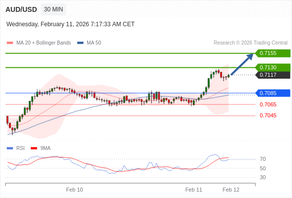 在 0.7085 之上,看涨,目标价位为 0.7130 ,然后为 0.7155 。