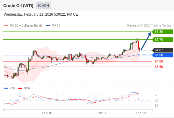 在 64.50 之上,看涨,目标价位为 65.70 ,然后为 66.30 。