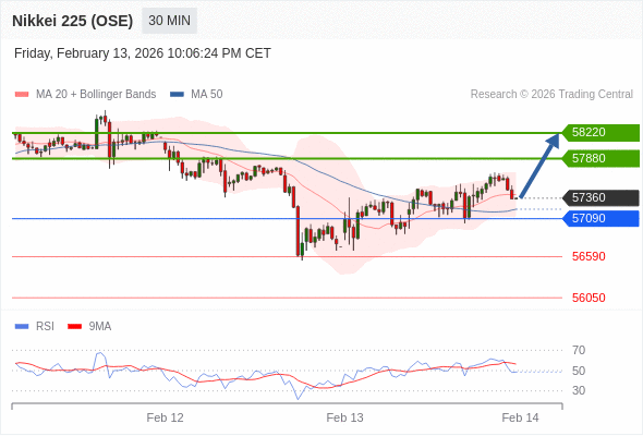 在 57090 之上,看涨,目标价位为 57880 ,然后为 58220 。