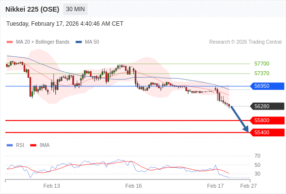 在 56950 之下,看跌,目标价位为 55800 ,然后为 55400 。