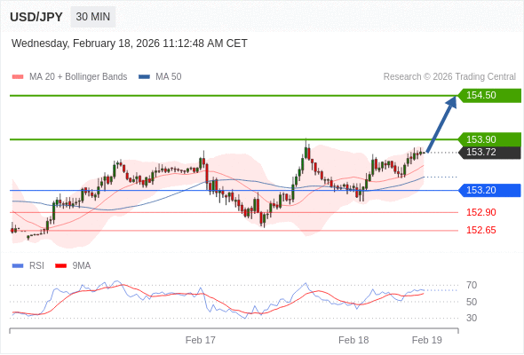 在 153.20 之上,看涨,目标价位为 153.90 ,然后为 154.50 。