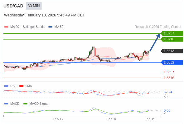 技术点评: RSI技术指标大于中性区域50。 MACD技术指标处在其信号线之上看多。 配置为正。 此外,价位高于其20天及50天移动平均线 ( 分别位于1.3659 和1.3651 )。