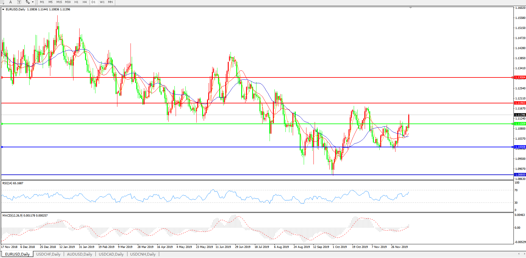 技术面简析:日图均线呈多头排列,汇价升穿1.11关口后维持攻势,MACD逼近0轴且量能在0轴上方维持放量迹象 ,RSI逐步走升,预计汇价有进一步上行空间。