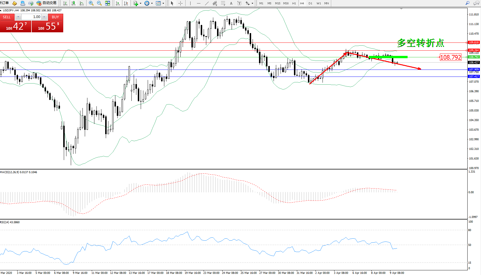 交易策略:108.792下方看跌,目标107.909107.417
