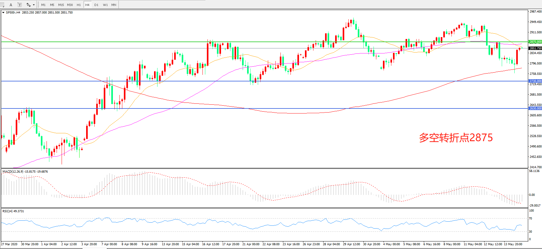 4小时图看,标普长阳拉升,200周期均线成为短期支撑,短期均线成为上方阻力, MACD绿柱减少,RSI指标走平,日内延续震荡概率较大。