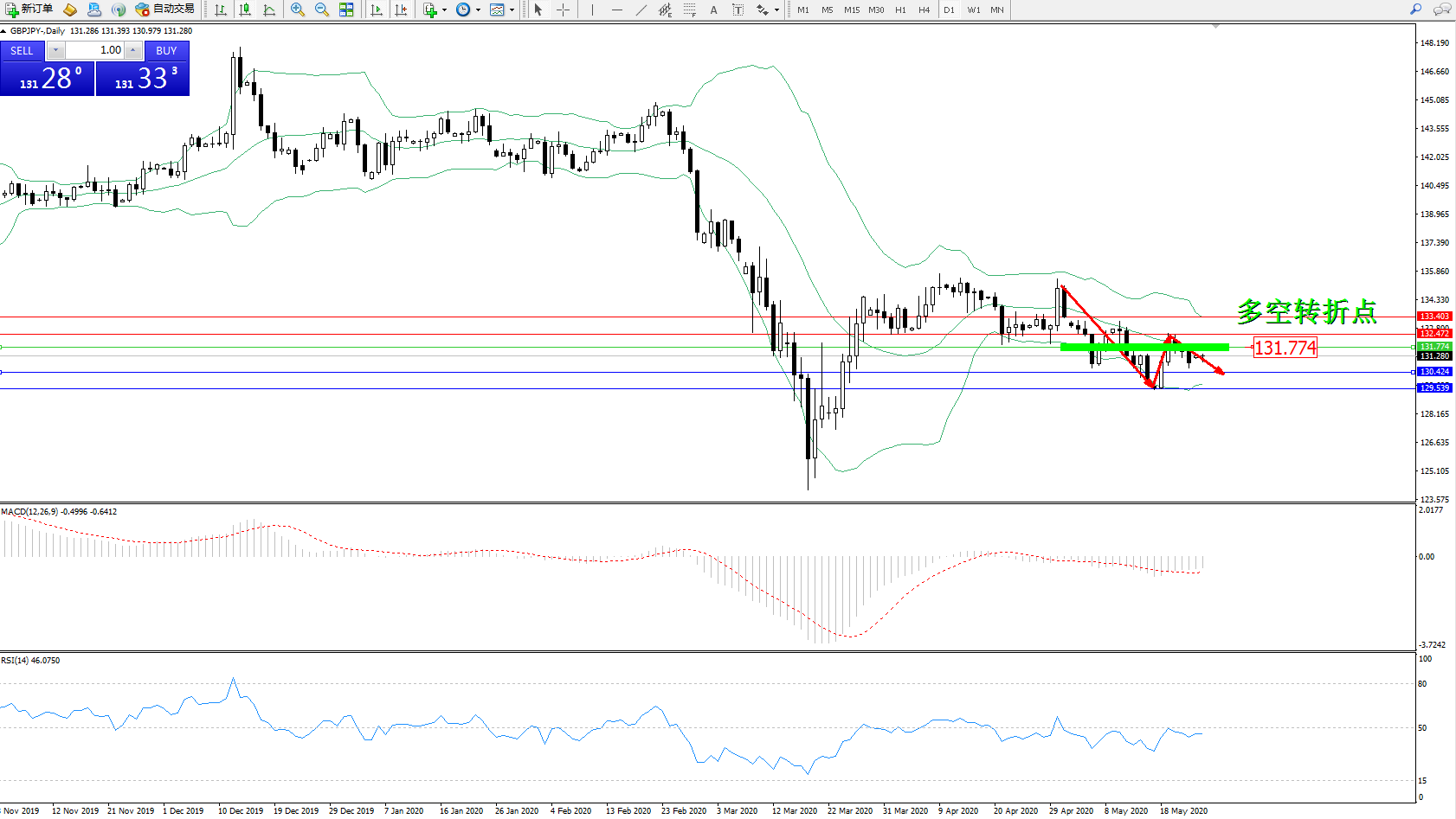 备选策略:131.774上方看涨,目标132.472、133.403