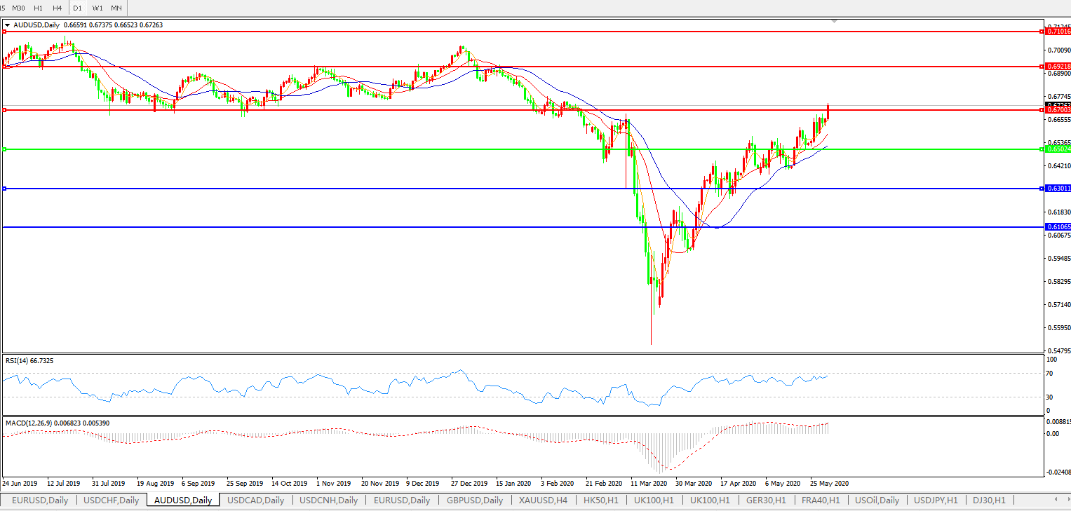 瑞士信贷讨论了澳元兑美元的技术面前景,强调0.6706一线对近期价格走出方向的重要性。澳元兑美元近日再现集中攻势,试图上破由200日均线、3月高点、以及2020年1月至3月下跌走势78.6%回调位0.6706水平组成的关键阻力区域。尽管这一货币对依然存在进一步盘整的可能,尤其是在上升三角形形态仍完好无损的情形下,但我行预测该阻力区域将限制多头获利,且寻求空头在适当的时候再次主导。出于这一考虑,我行认为汇价的初步支撑位见于0.6568一线,进而是0.6538一线,进而是5月下旬低点和21日指数均线所在的0.6520-06区域。预计在汇价触及0.6520-06区域时将出现新的买盘兴趣,收于该区域下方将削弱上升三角形形态完好无损的立场,并加强震荡走低的可能,使得后一支撑位0.6412-00区域进入视野。相反,日线收涨于0.6706一线将标注为对主要阻力位的上攻破位,且转变中期风险为上行,后市阻力位因此也上移至0.67445-50区域,进而是2月份高点0.6774水平。