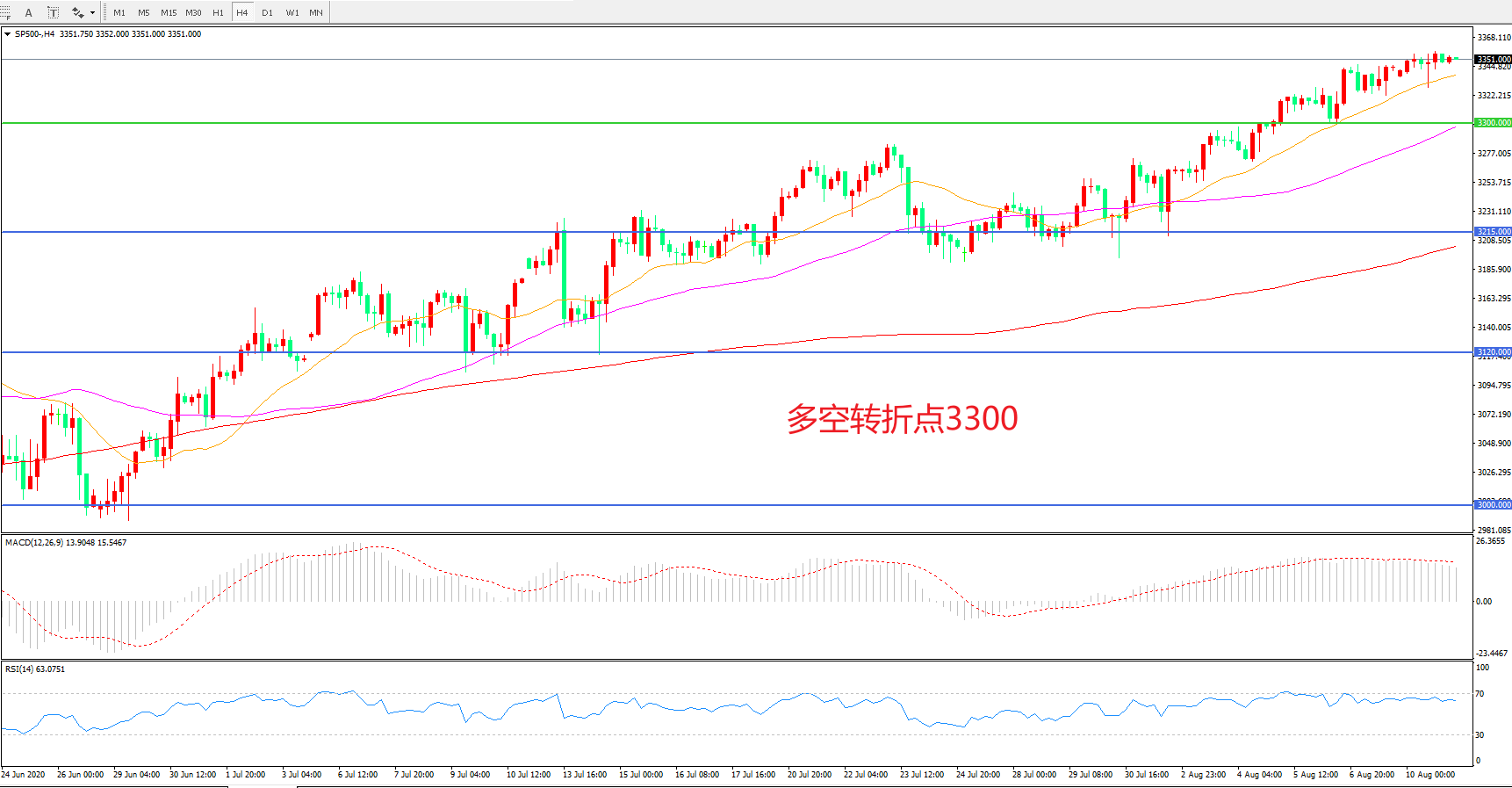4小时图看,标普500延续高位震荡,整体表现偏强,均线系统呈多头排列, MACD红柱减少,RSI指标走平,日内延续上行概率较大。