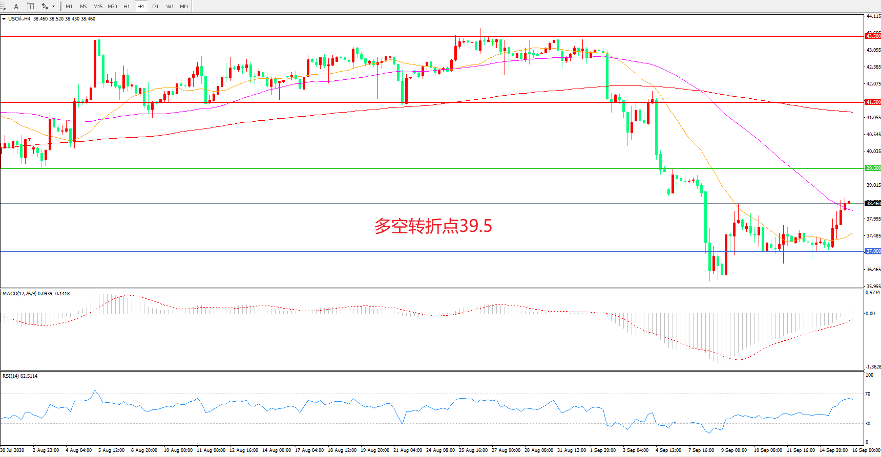 4小时图看,油价低位调整后连续反弹,短期走势有所回暖,但39.5依然是上方明显阻力,均线系统走平,MACD红柱增加,RSI指标走平,日内延续震荡概率较大。