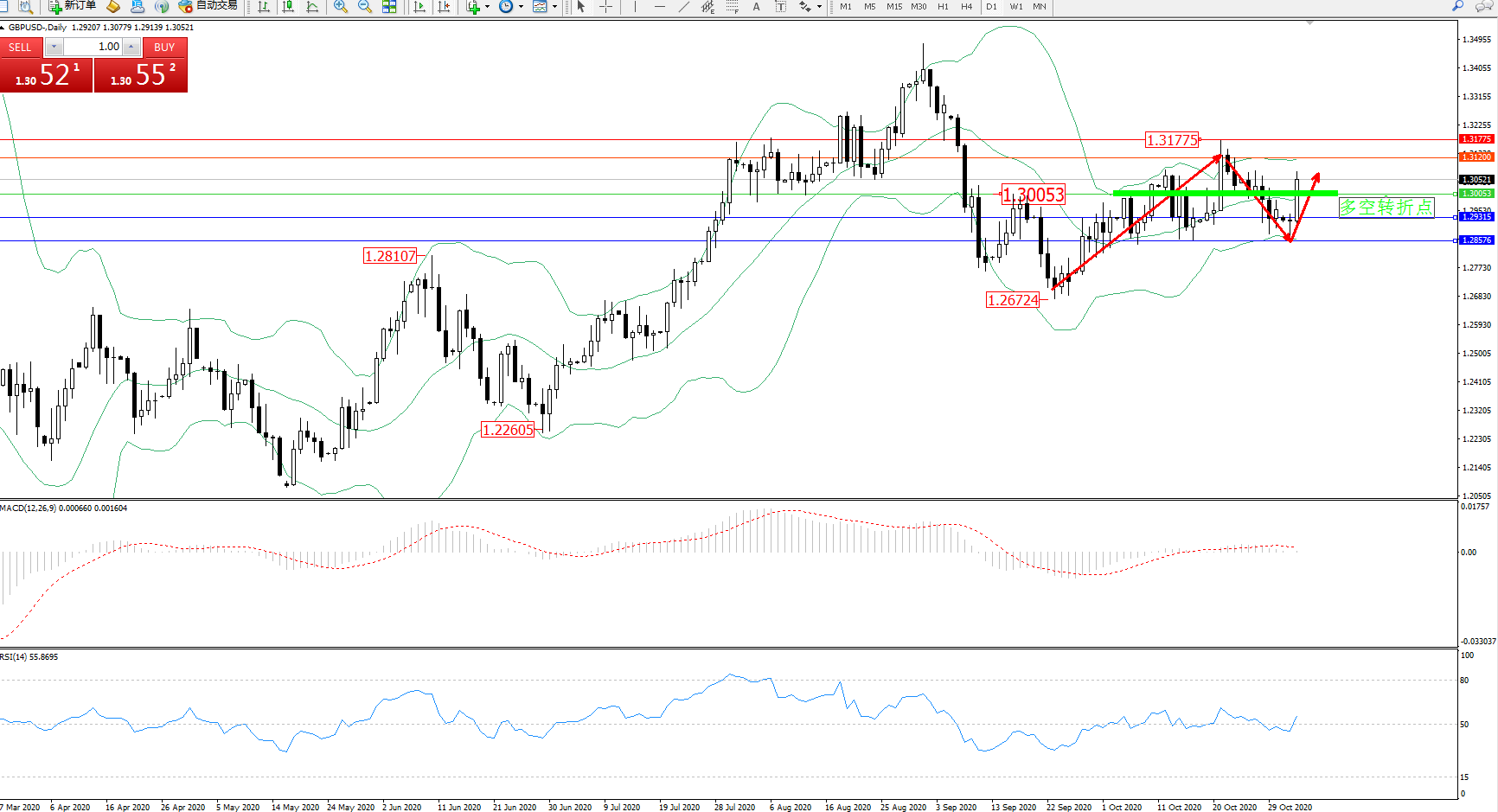 交易策略:1.30053上方看涨,目标1.31200、1.31775