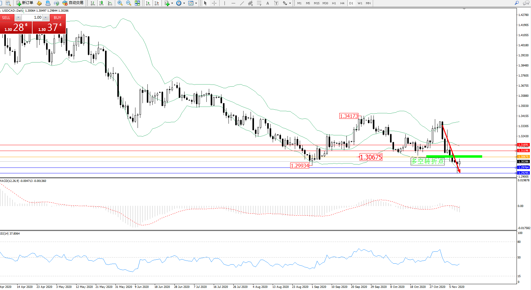 美元加元USDCAD——日K线图显示: