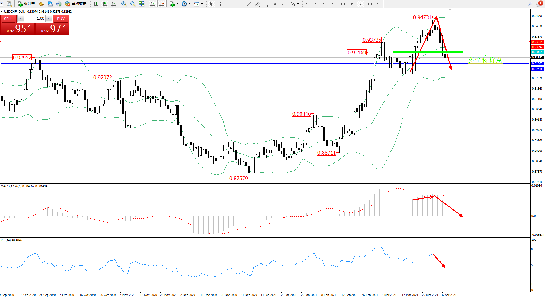技术点评:多头动力延续布林带指标中上轨区间持续震荡上扬,高位抵达0.94731附近遇阻急速下挫,跌破中轨附近节点后不断向下移动中,布林带指标呈张口走势后开始有收口迹象,MACD指标处于多头区域持续震荡后继续下行,RSI指标处于多头区域维持震荡后不断下移至50均衡线附近维持震荡中;
