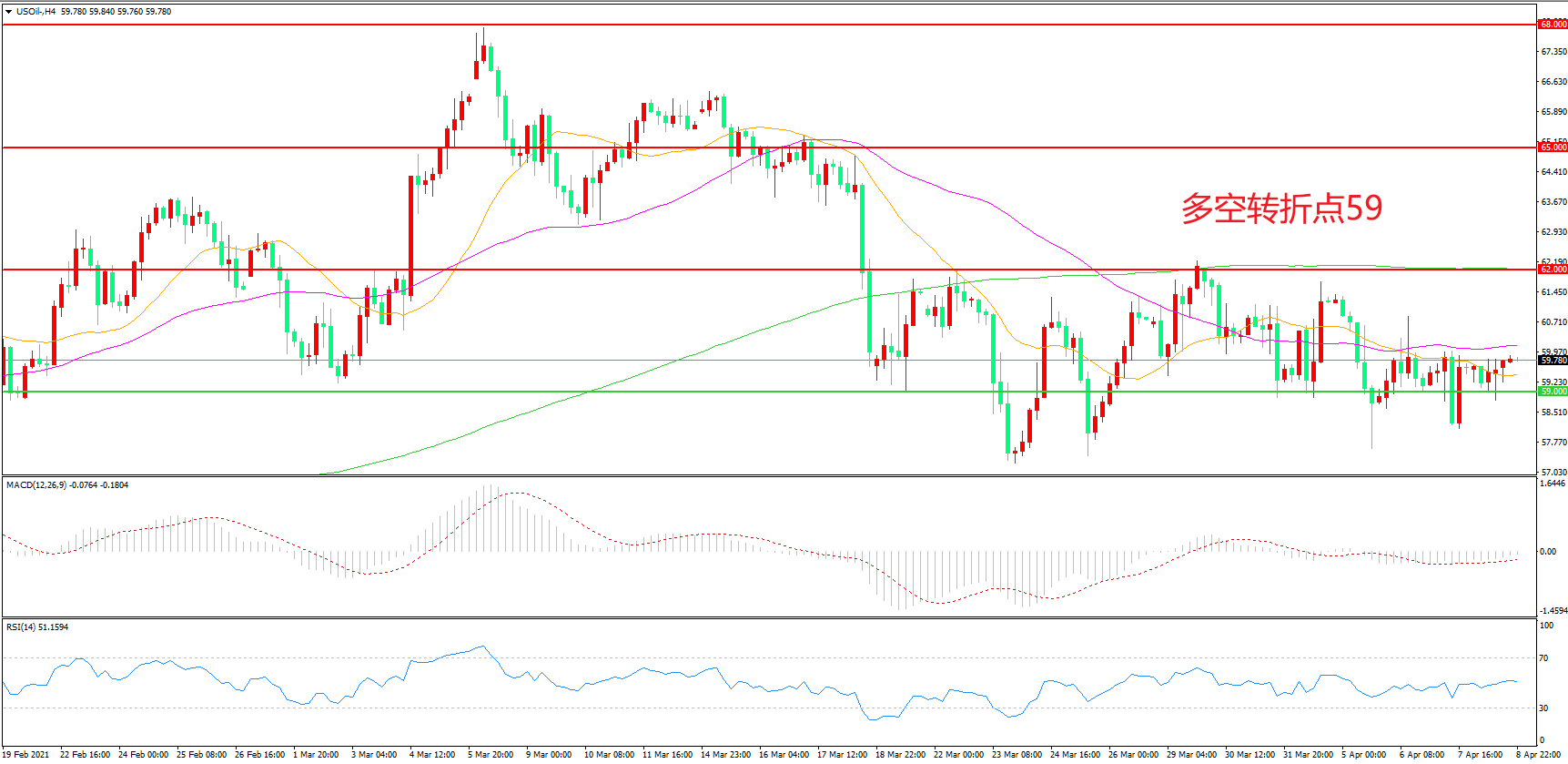 4小时图看,油价先跌后涨,区间震荡迹象明显,均线系统粘合形成上方阻力,59美元成为下方支撑,MACD绿柱缩短,RSI指标走平,日内延续下行概率较大。