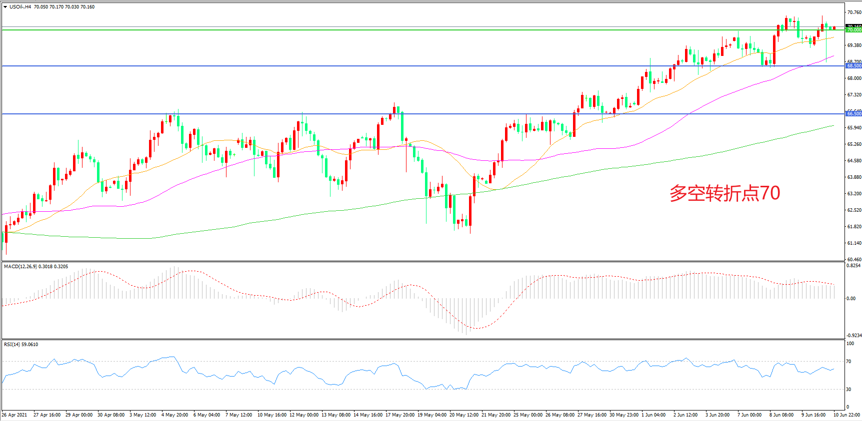 4小时图看,油价先跌后涨,回踩55周期均线后再度拉升,短线表现偏强,70美元成为短期多空分水岭,MACD红柱增加,RSI指标走平,日内上行概率较大。