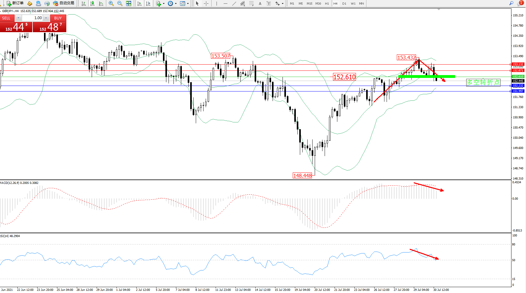 交易策略:152.610下方看跌,目标152.232、151.997
