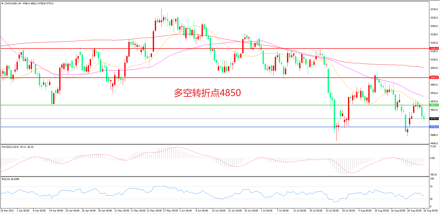 4小时图看,沪深300长阴下破,短期走势陷入低迷,均线系统呈空头排列,4850成为多空分水岭,MACD绿柱缩短,RSI指标走平,日内震荡下行概率较大。