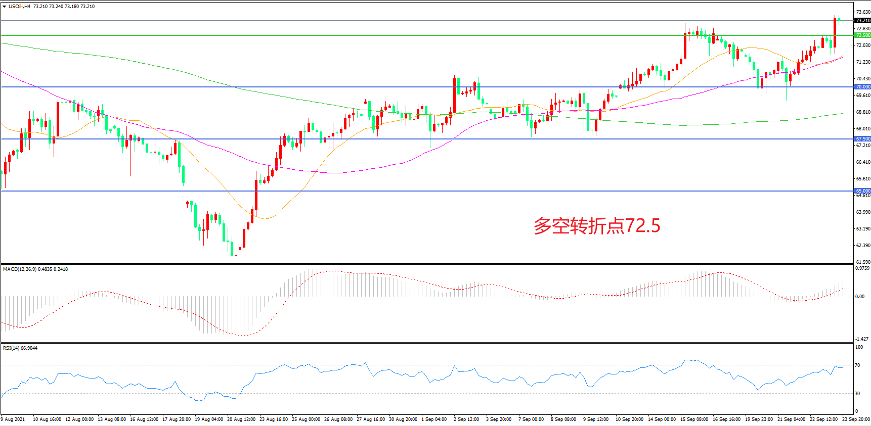 4小时图看,油价长阳拉升,短期走势偏强,均线系统粘合形成下方支撑,MACD红柱增加,RSI指标走平,日内震荡上行概率较大。