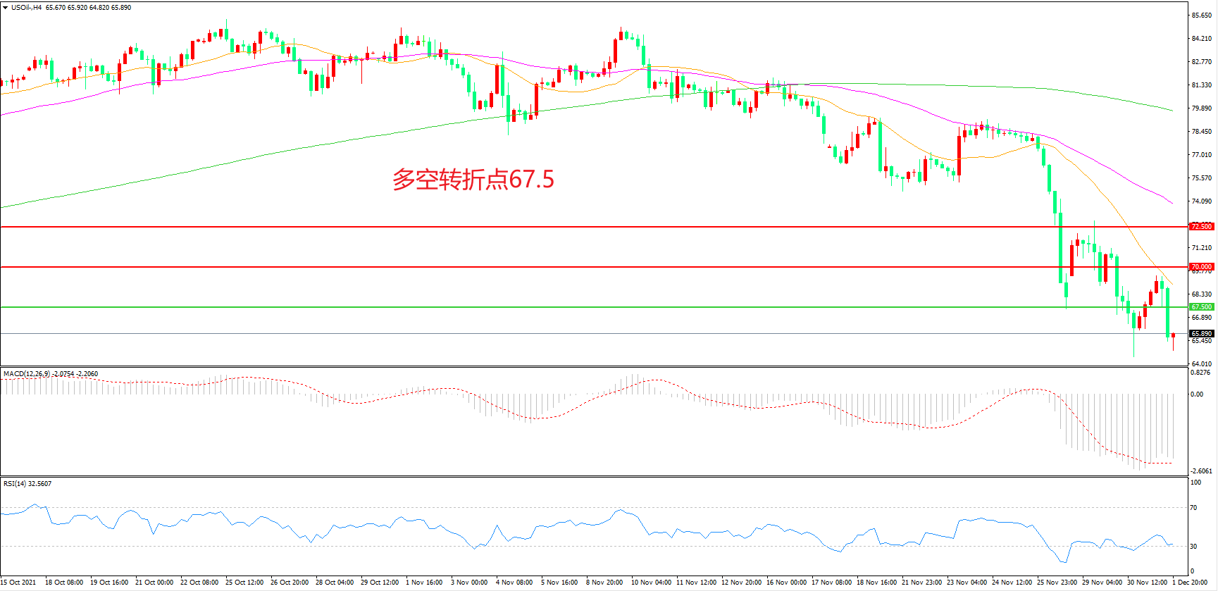 交易策略: 在67.50之下看跌,目标65.00        62.00