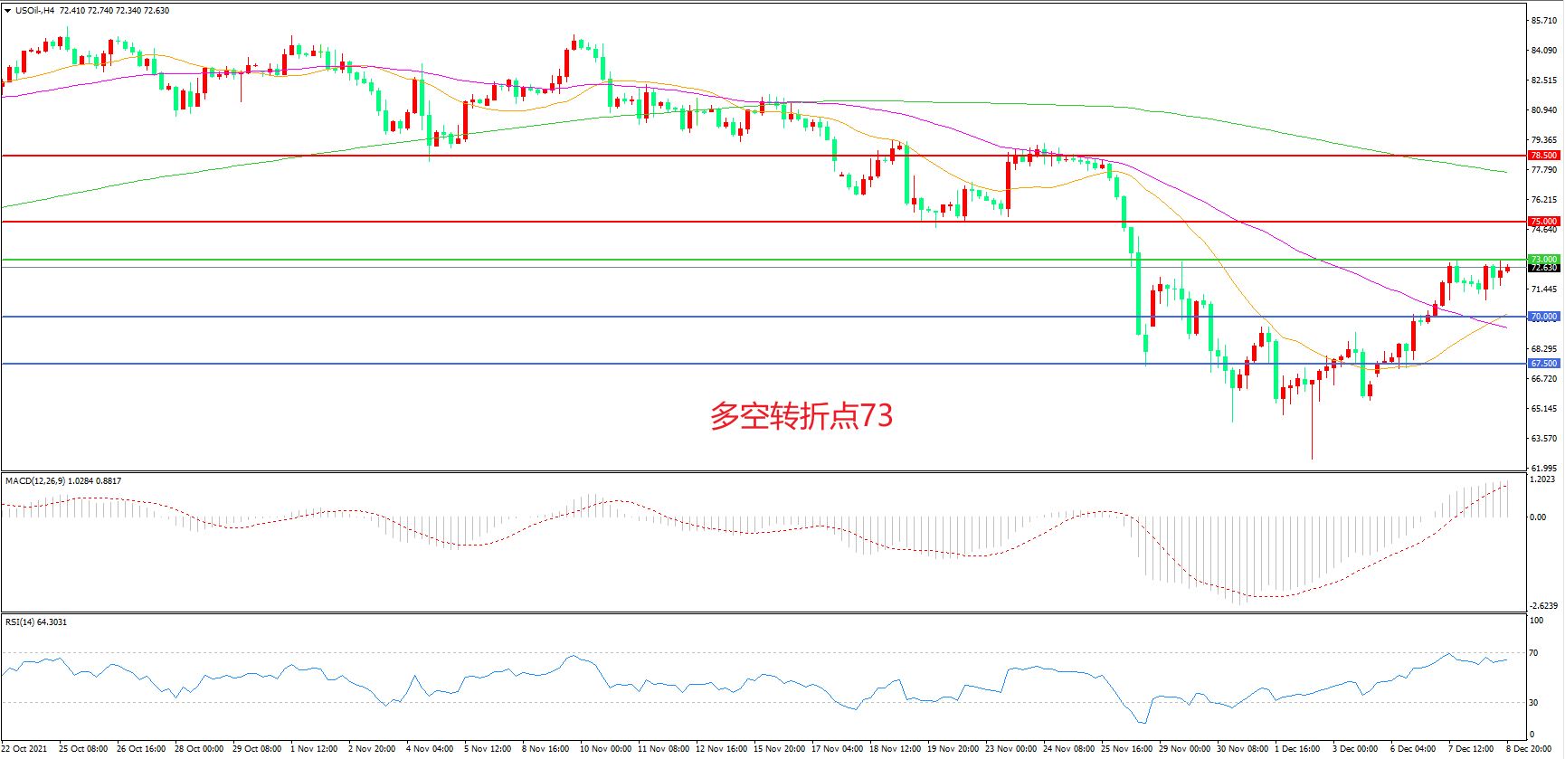 多空转折点:73.00