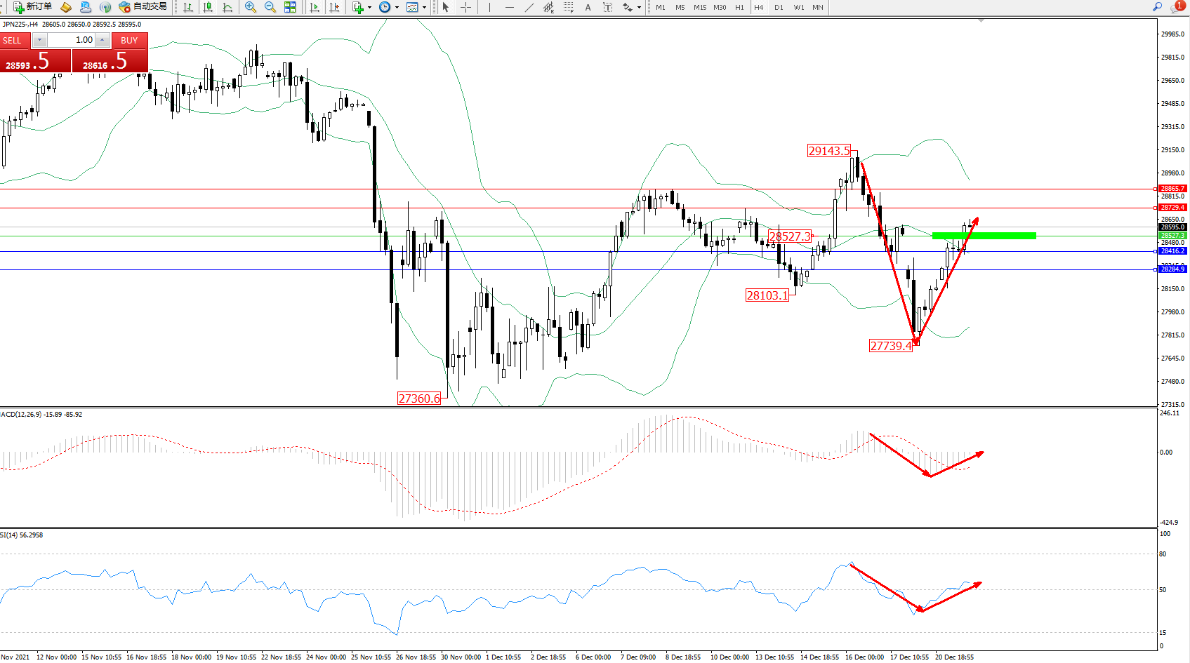技术点评:空头动力持续震荡下行,低位抵达27739附近节点得到支撑呈V型反转强势拉升,突破布林带指标中轨进入中上轨区间震荡,多头动力有继续向上移动迹象,布林带指标呈张口走势后开始收口,MACD指标处于空头区域呈V型反转上移至0轴线附近徘徊,RSI指标处于空头区域低位震荡上移至50均衡线上側整理;