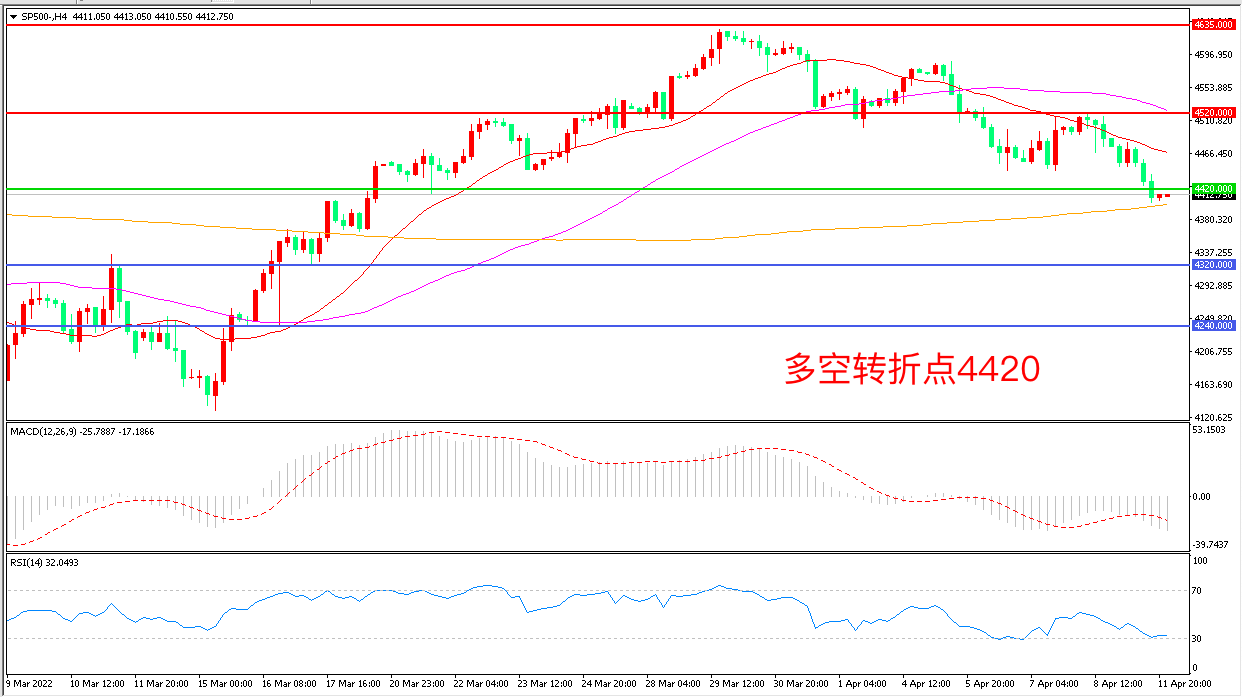 4小时图看,标普500连续下挫,短期表现低迷,200周期均线成为短期支撑,21周期均线成为上方阻力,MACD绿柱增加,RSI指标走平,日内震荡回落概率较大。