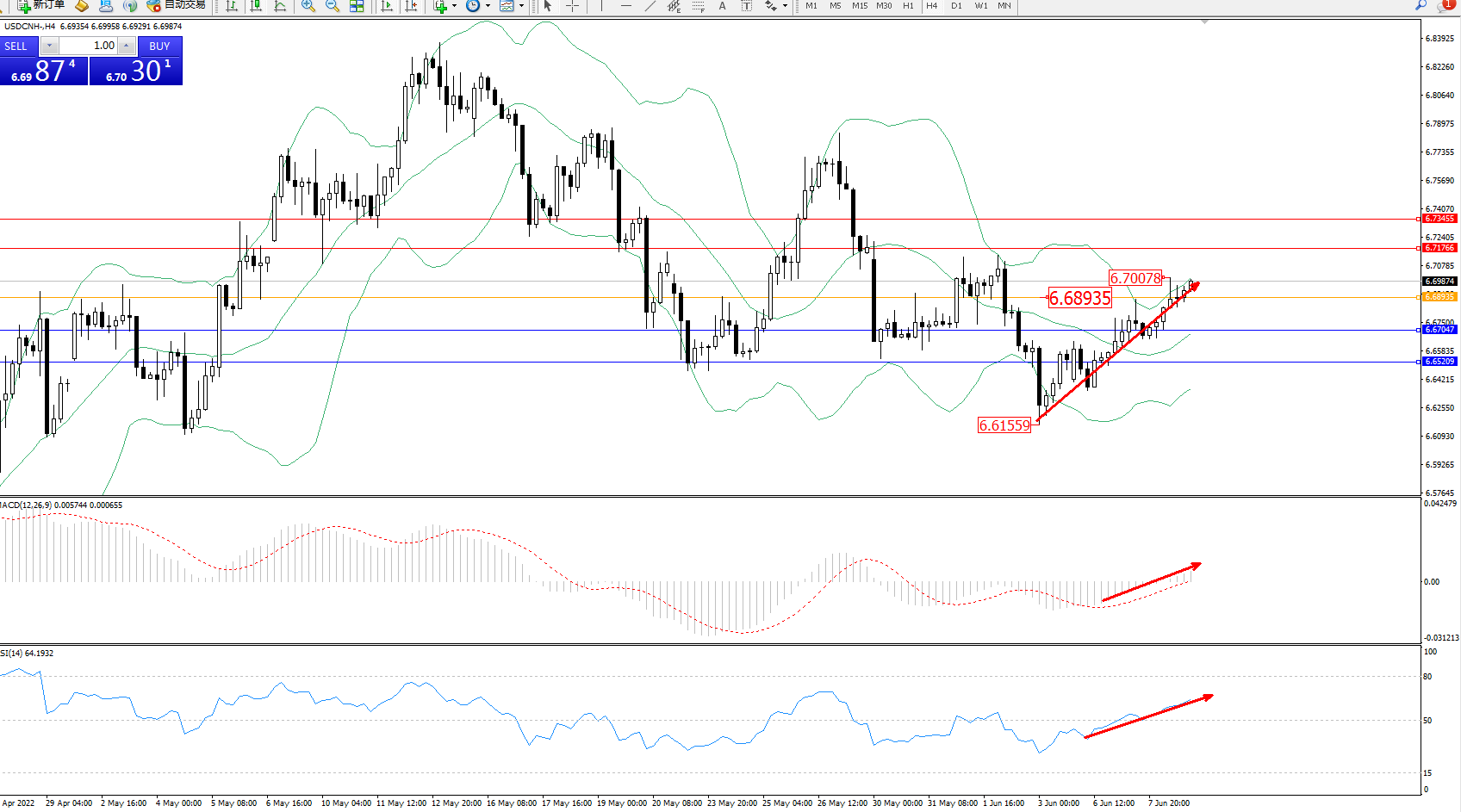 交易策略:6.68935上方看涨,目标6.71766、6.73455