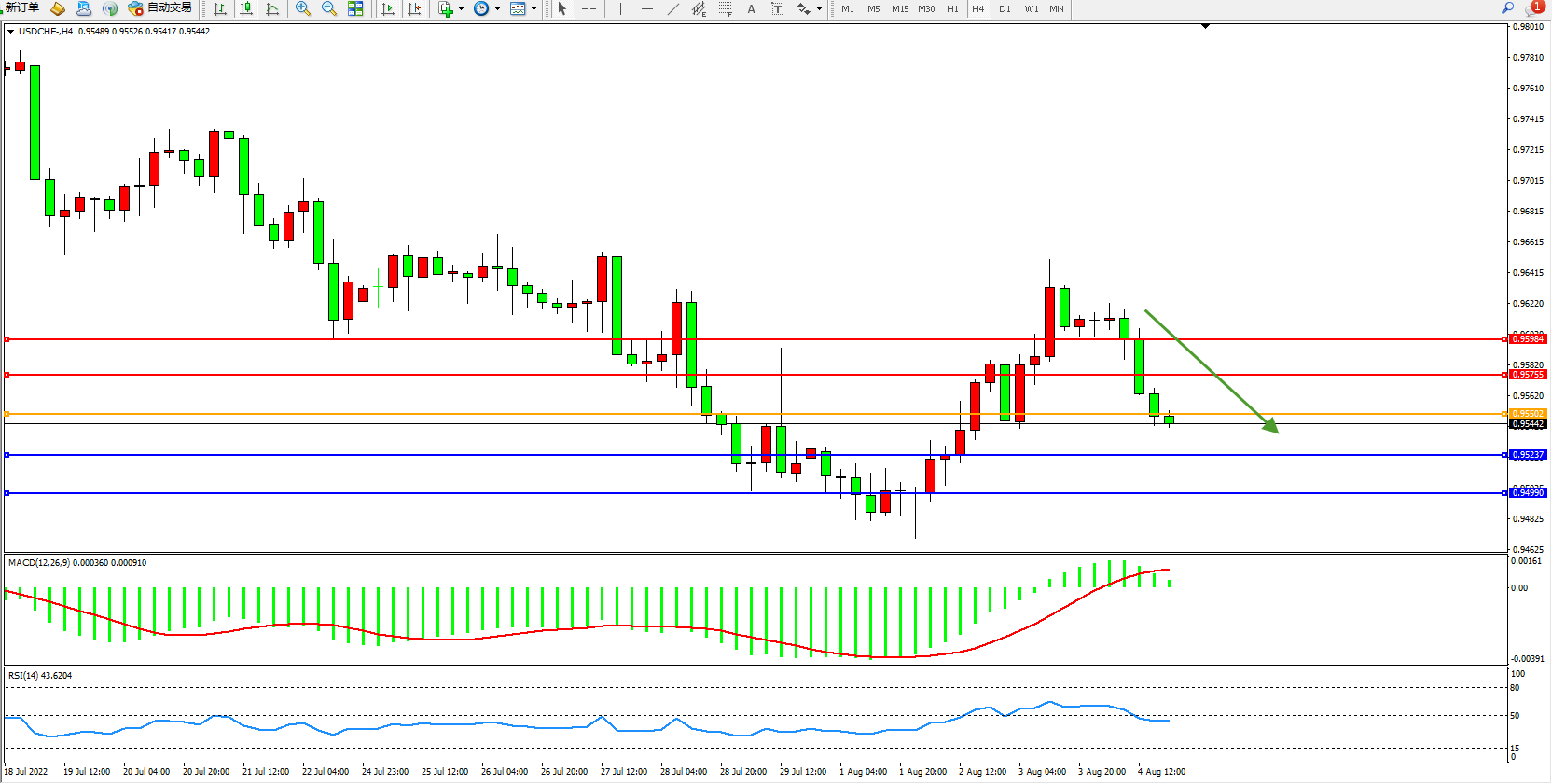 美元瑞郎USDCHF——4小时K线图显示:
