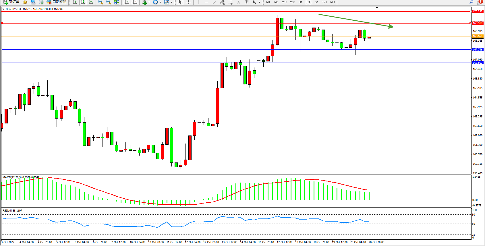 备选策略:168.660上方看涨,目标169.518、170.293