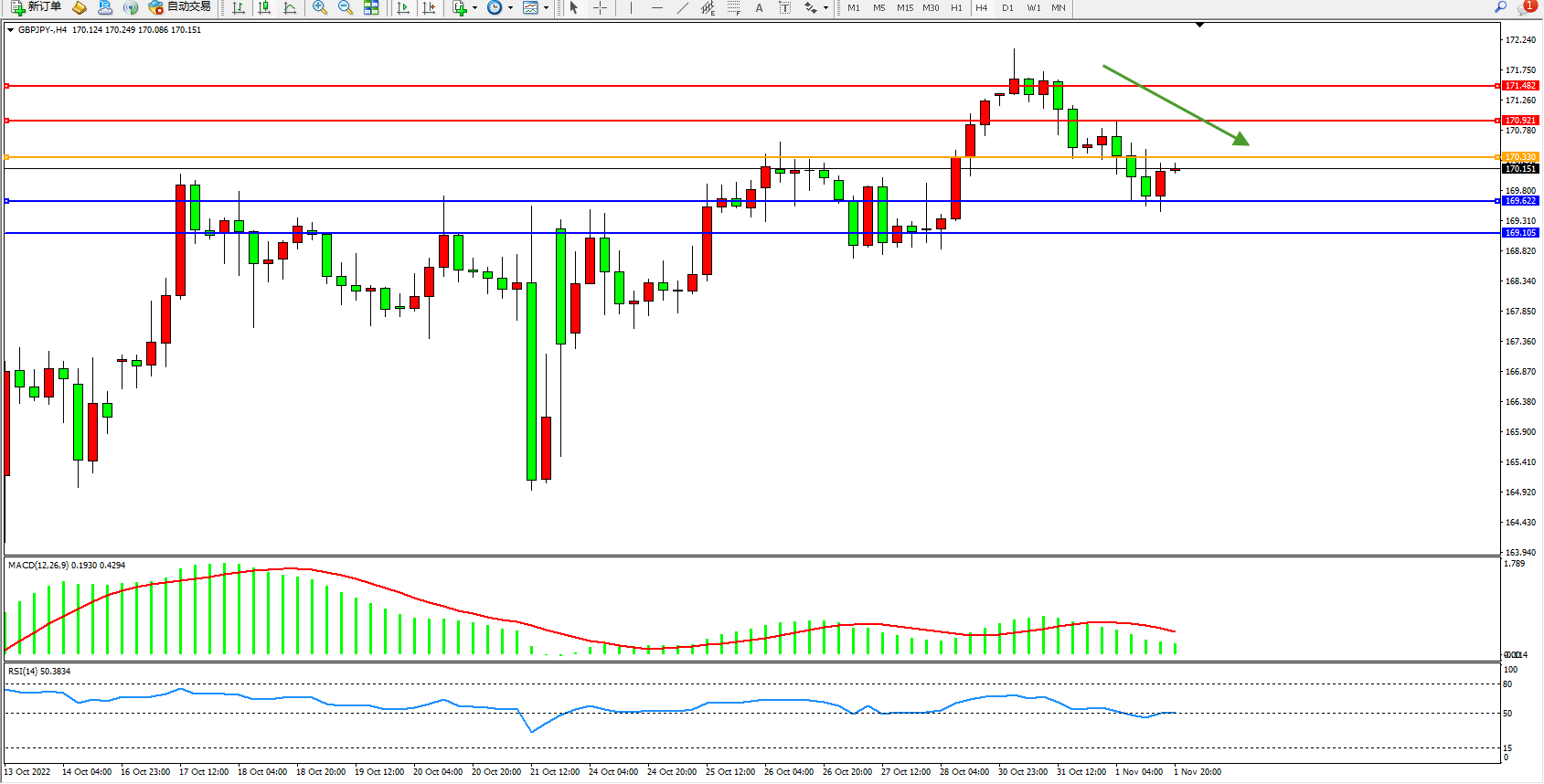 交易策略:170.330下方看跌,目标169.622、169.105