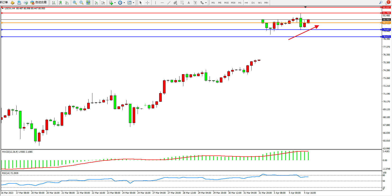 4小时图看:高位短期窄幅整理,市场整体处于高位攀升后震荡,MACD指标处于多头区域高位徘徊,RSI指标处于多头区域维持整理;