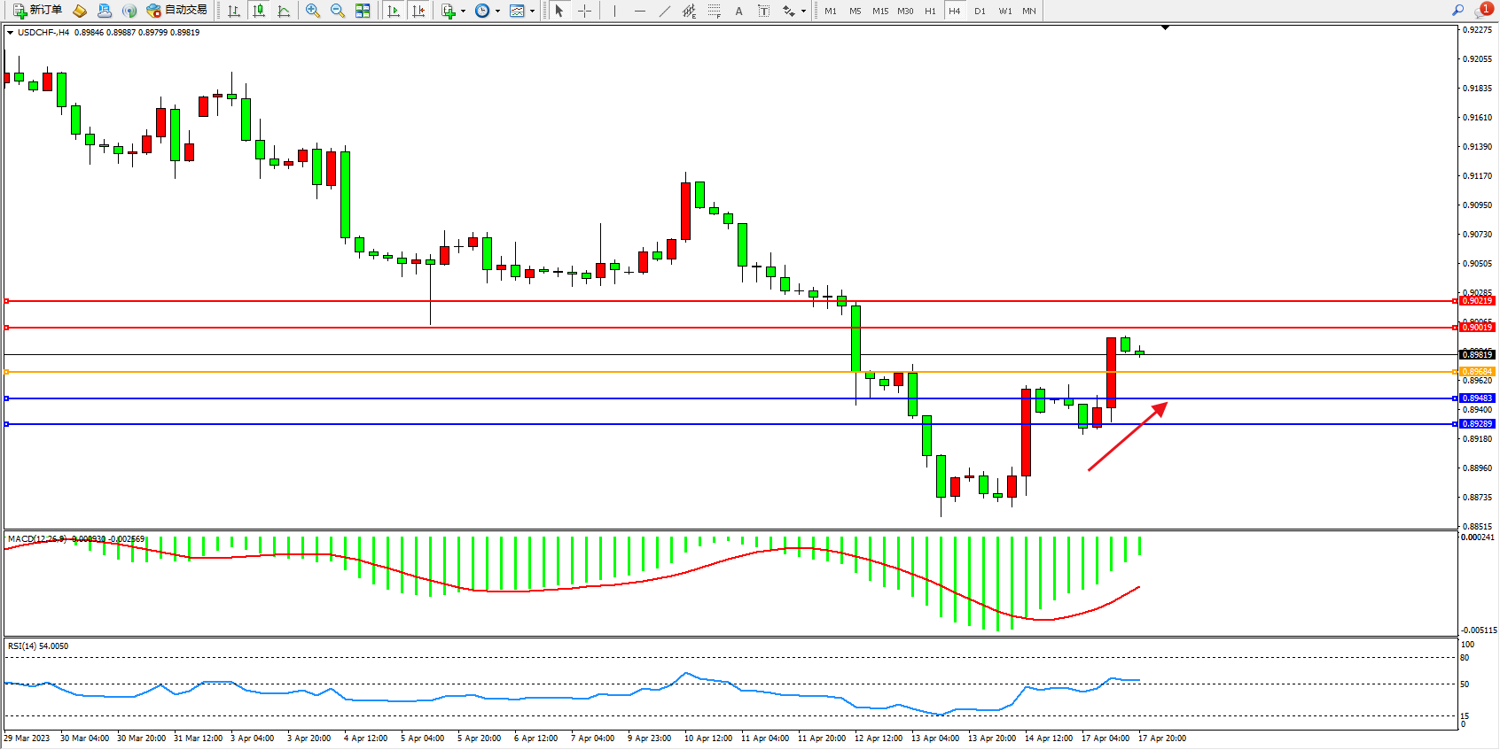 交易策略:0.89684上方看涨,目标0.90019 0.90219