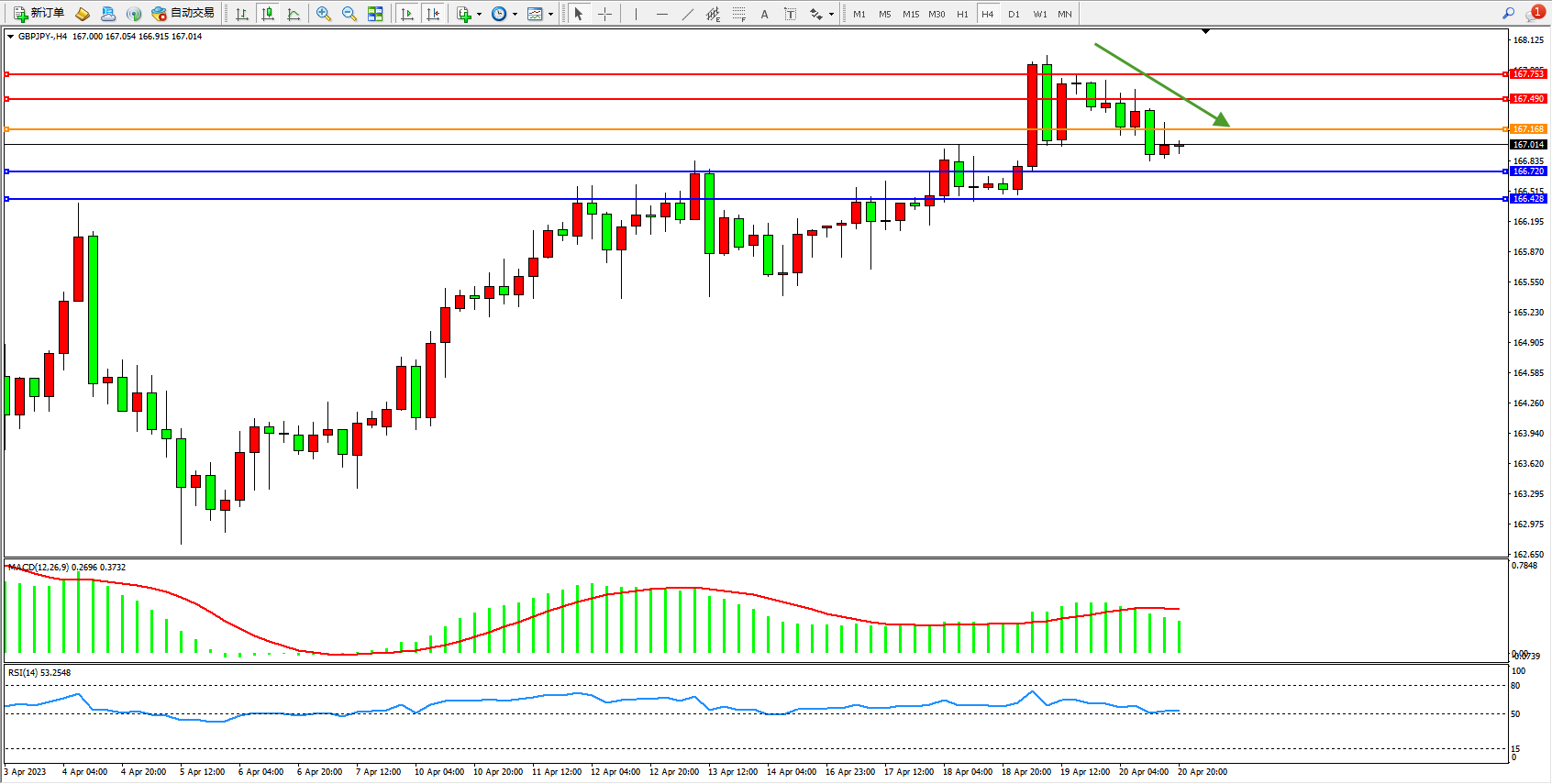 交易策略:167.168下方看跌,目标166.720  166.428