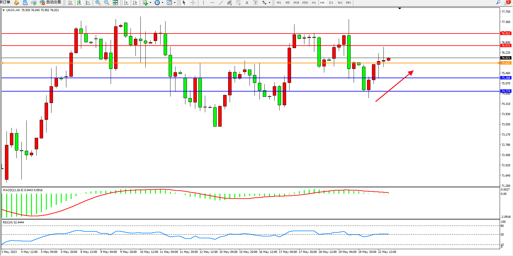 4小时图看:短期宽幅震荡后区间上移,市场多头动力短期持续,MACD指标处于0轴线附近弱势整理,RSI指标处于50均衡线附近弱势徘徊;