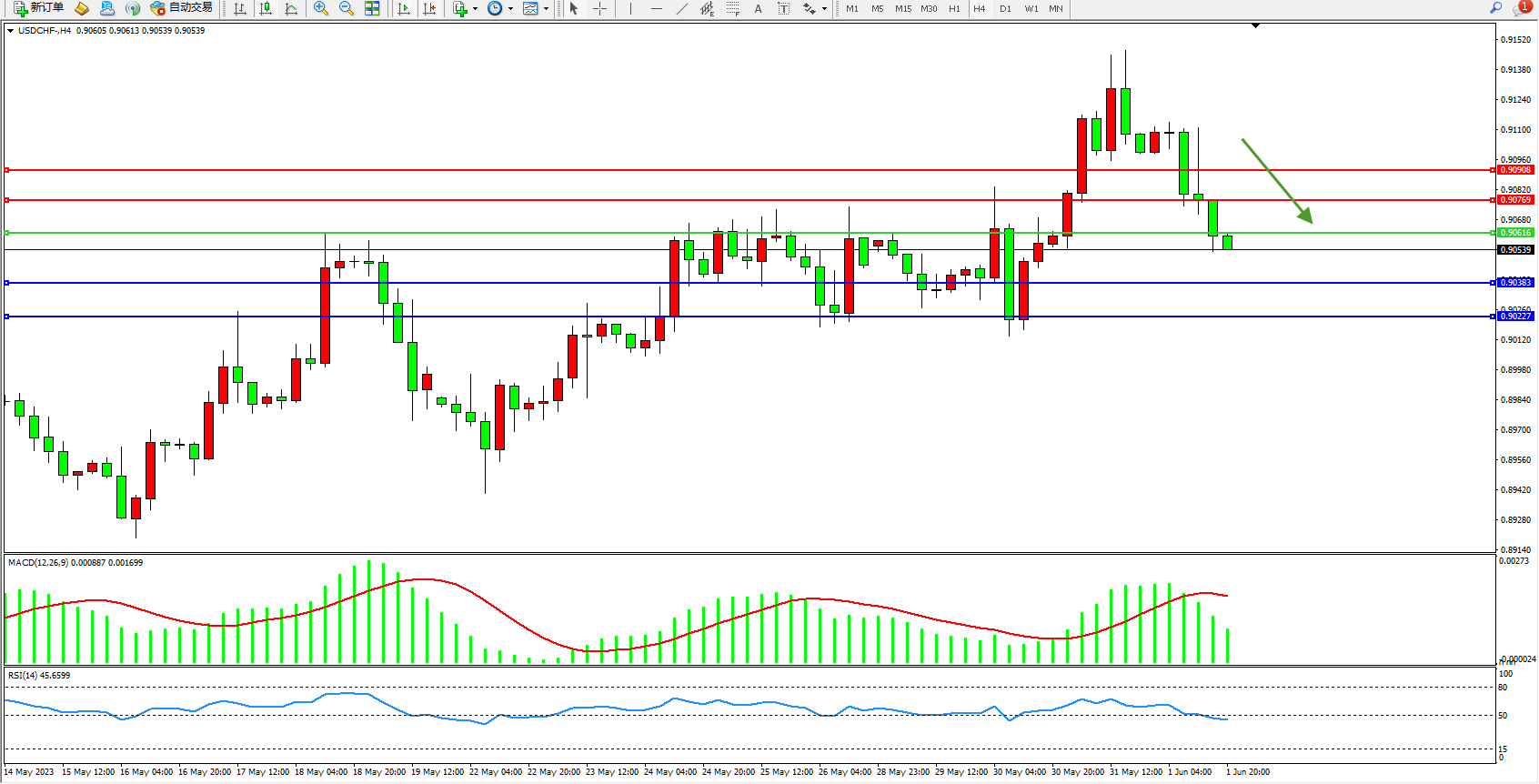 美元瑞郎USDCHF——4小时K线图显示: